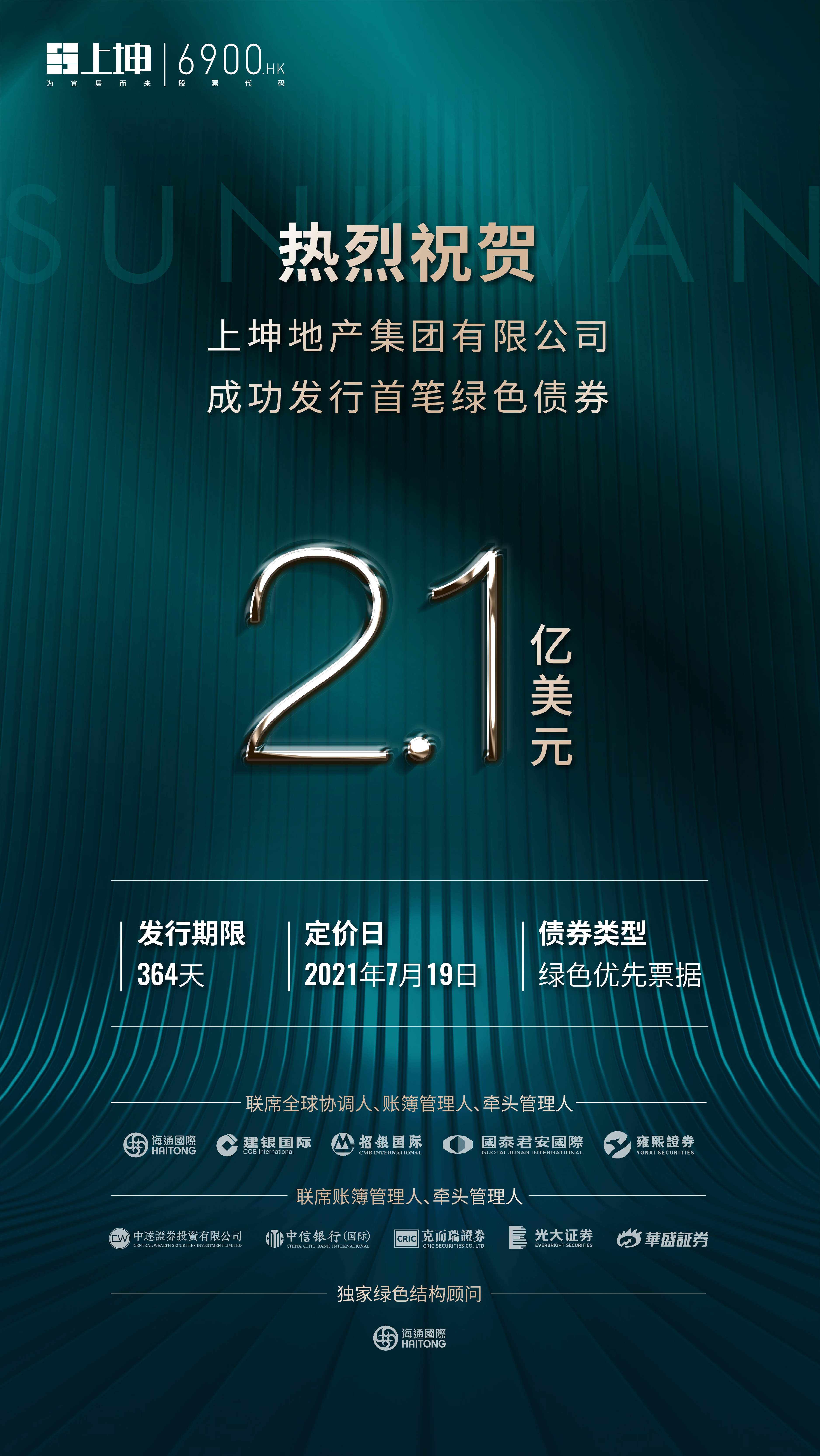 7月19日,上坤地產(chǎn)(6900.HK)宣布,發(fā)行總額2.1億美元364天綠色優(yōu)先債券。這是上坤地產(chǎn)自去年底上市后發(fā)行的第二筆美元債,也是公司首次嘗試發(fā)行綠色債券。