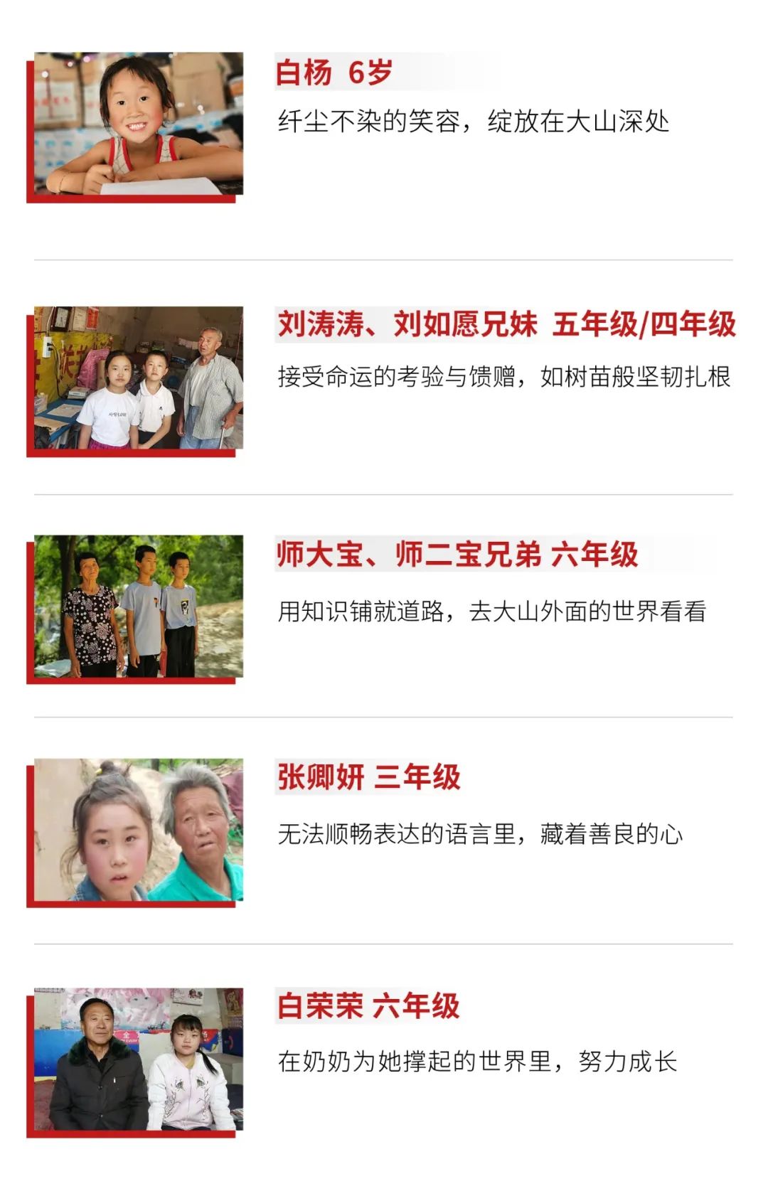六年級(jí)的白榮榮,患有先天性智力障礙。為了給孩子治病,父母常年在外打工,榮榮便跟著奶奶生活。雖然語(yǔ)言表達(dá)能力差,成績(jī)不好,但她經(jīng)常幫奶奶干一些力所能及的家務(wù),有好吃就會(huì)與奶奶分享。在白榮榮的心中,奶奶是她最親的人,也是如同大山般的依靠。